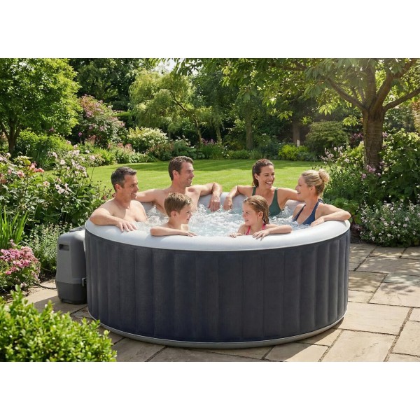 Phuket Laminated PVC Round Blue Laser Spa — pripučiama džakuzi, deranti premium dizainą su „mėlynų lazerinių linijų“ efektu ir dideliu patikimumu. Naudojant laminuotą PVC ir vidinę I-Beam struktūrą, korpusas išlaiko idealią formą ir atsparumą deformacijai net esant pilnai apkrovai, užtikrinant patogų poilsį kompanijai iki 6 asmenų.
