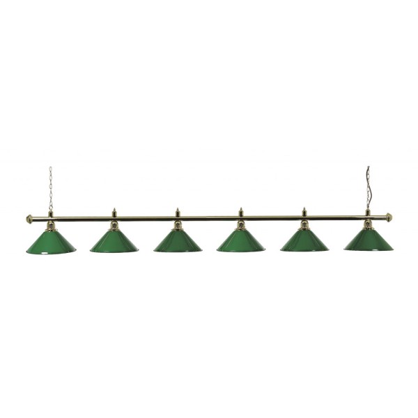 Šviestuvas Evergreen 6 gaubtų. Žalios spalvos gaubtai, auksinės spalvos skersinis. Tinka 12 pėdų biliardo stalui.