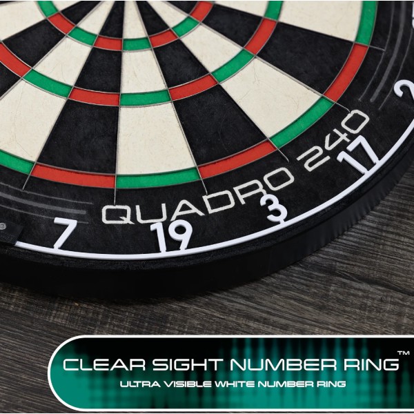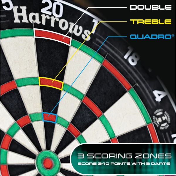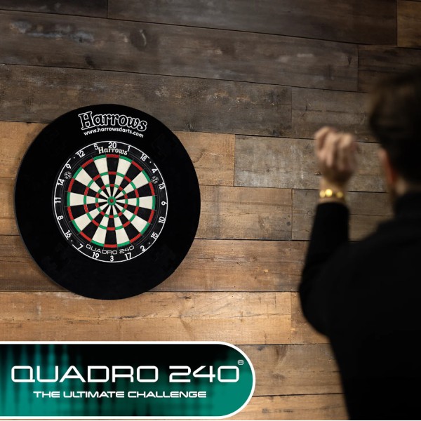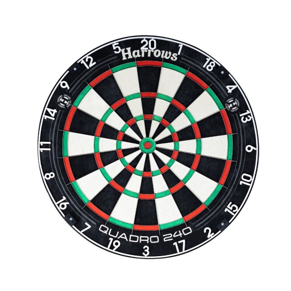 Quadro 240 taikinys — tikras dartų kultūros klasika, grįžta su inovatyviais patobulinimais! Pirmą kartą pristatytas Harrows Darts Technology 1992 metais, šis taikinys išsiskyrė savo „Quadro“ taškų sekcijomis, kurios pridėjo visiškai naują posūkį tradiciniam dartų žaidimui. Be įprastų viengubų, dvigubų ir trigubų žiedų, Quadro 240 turi unikalią keturgubą sekciją, leidžiančią žaidėjams surinkti keturis kartus didesnį taškų skaičių. Taigi, didžiausias įmanomas taškų skaičius vienu strėlytės metimu yra keturgubas 20 (80), o maksimali suma su trimis strėlytėmis – 240.